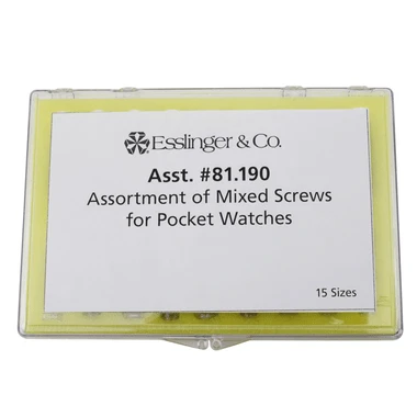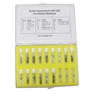 This pocket watch screw replacement kit is perfect since pocket watch parts are so hard to find. Screws are commonly broken or missing on pocket watches since they are older and many people have usually worked on them. With this kit you should be able to save time searching for a screw to fit the watch. This kit includes 18 dozen screws that are made to fit 15 different screw types. Refills are not available. Swiss made.