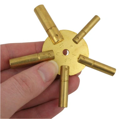 Universal brass clock key with 5 prongs for winding clocks. The universal clock key covers the 5 most popular even sizes 2, 4, 6, 8 and 10. Great for clock repair or collectors and makes organization much easier. A 5 in 1 odd size clock key is also available for the complete set. The Even Sizes include: 2.75mm – 7/64 inch (2), 3.25mm – 1/8 inch (4), 3.75mm – 0.14 inch (6), 4.25mm – 11/64 inch (8), and 4.75mm – 3/16 inch (10). Measurements are approximate.