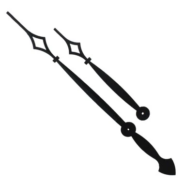 These oversized, extra large clock hands are perfect for custom clocks or for repairing older large clocks. They should be used with high torque clock movement motors. Available in straight and spade shape and black or yellow in color, see chart below or drop-down menu for sizing information. Mounting holes consist of one round hole for the hour hand (5mm in diameter) and a rectangular mounting hole (3.0 x 4.0mm) for the minute hand.