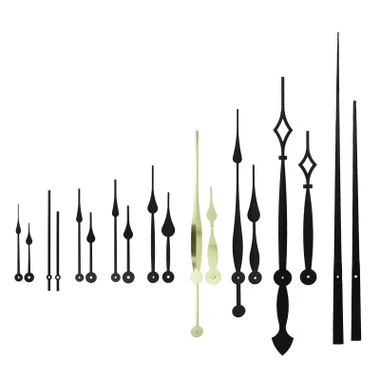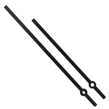 These oversized, extra large clock hands are perfect for custom clocks or for repairing older large clocks. They should be used with high torque clock movement motors. Available in straight and spade shape and black or yellow in color, see chart below or drop-down menu for sizing information. Mounting holes consist of one round hole for the hour hand (5mm in diameter) and a rectangular mounting hole (3.0 x 4.0mm) for the minute hand.