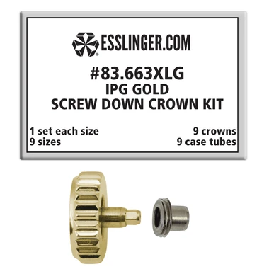 This crown assortment is an easy way to replace those hard to find extra large threaded crowns. These threaded watch crowns are perfect for many different brand watches. Each crown comes complete with a case tube. These crowns are stainless steel with IPG color. With 9 different crown size options you can be sure to find a threaded crown to fit your watch whether you use just the crown or the crown and tube complete. Case ends are smooth to friction fit into your case. Kit contains 9 different crown diameter options. Kit includes sizes in the chart below. Refills available separately.  Â