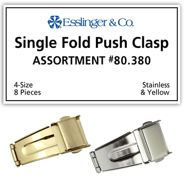 This is an excellent assortment of Single Fold with push button watch band clasps for watchmakers because it contains a variety of watch band clasps. This popular clasp style is made to replace name brand and factory direct watch band clasps at a fraction of the cost! The single fold with push button clasp offers the same amount of security that the tri-fold offers, but is less bulky. It features a push button release for optimum protection from loss. This assortment includes 8 different single fold with push button clasps. They are designed to fit metal watch bands. These clasps are great for people who want extra security for their watch in a sleek style. These watch bands clasps can be used to replace a broken clasp or to upgrade your current watch band clasp. The watch band clasps are attached with a simple spring watch pin that is easy to remove making this a quick replacement job that anyone can do.