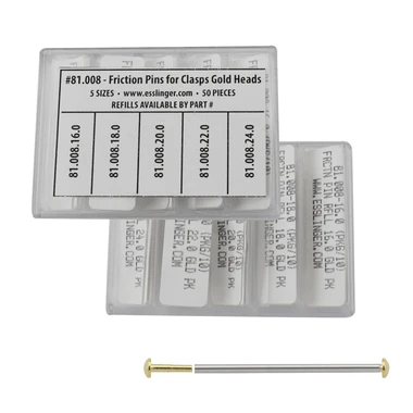 This is a watch band friction pin assortment with gold heads. With these gold heads you can match most clasps and bands. These hold the security catch or latch onto the clasp. Each size friction pin is sold in a set of 10 tubes (with 2 heads per pin), allowing you to decide the size of the replacement friction pin you need. Slide the tube through the clasp and latch then pound the heads into each side for a firm fit. Made of stainless steel with gold plating. Assortment includes all 5 lengths available. Refills sold separately.